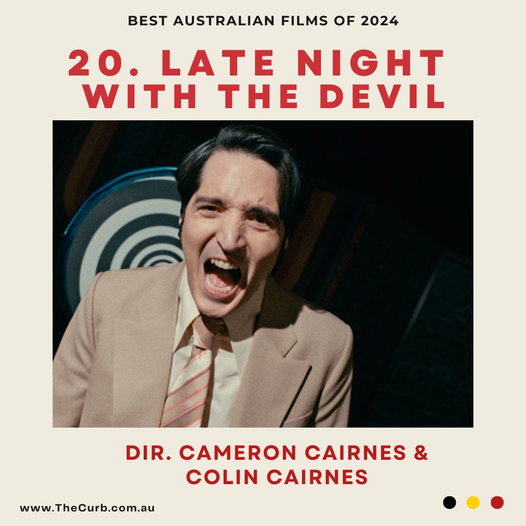 The Cairnes brothers manage to pull off the impossible with their runaway horror hit Late Night with the Devil by creating a distinctly Australian feeling film set in America. The shadow of Don Lane and James Randi hangs over this story of Jack Delroy, David Dastmalchian’s energetic talk show host who is on the precipice of cancelation as he hosts his annual horror show. Pulling out all stops to make a memorable night, Delroy calls upon sceptic Carmichael Haig (Ian Bliss) and mystic Christou (Fayssal Bazzi) to add some drama to the night, before bringing on the possessed Lilly (Ingrid Torelli) and her support June Ross-Mitchell (Laura Gordon), effectively opening the gates of hell. The talk show format is a purely American invention, but in Late Night with the Devil, the vibe is distinctly Australian, partly in thanks to the ‘found footage’ format which presents the story with a hurried and hectic tone underpinned by a ‘she’ll be right’ attitude that flies in the face of the demonic chaos that emerges in the climax. But hey, that’s show biz right?