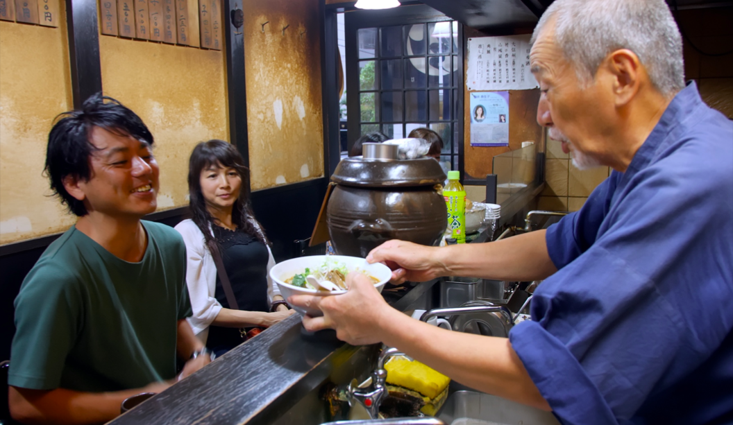 I felt like it really was, and it's our film, it's not my film. That was very important to me that we're both on equal footing there. I think with documentary, it is important that the producer shares authorship. Because it's such an important part of the film's existence, what the producer does in the capturing of this footage. In our case, Wataru was essential in doing all those interviews and he was there as a waiter, you know, helping out. When we were shooting at night there, he was often tasked with bringing bowls around to the customers upstairs. He put on an apron to help out.