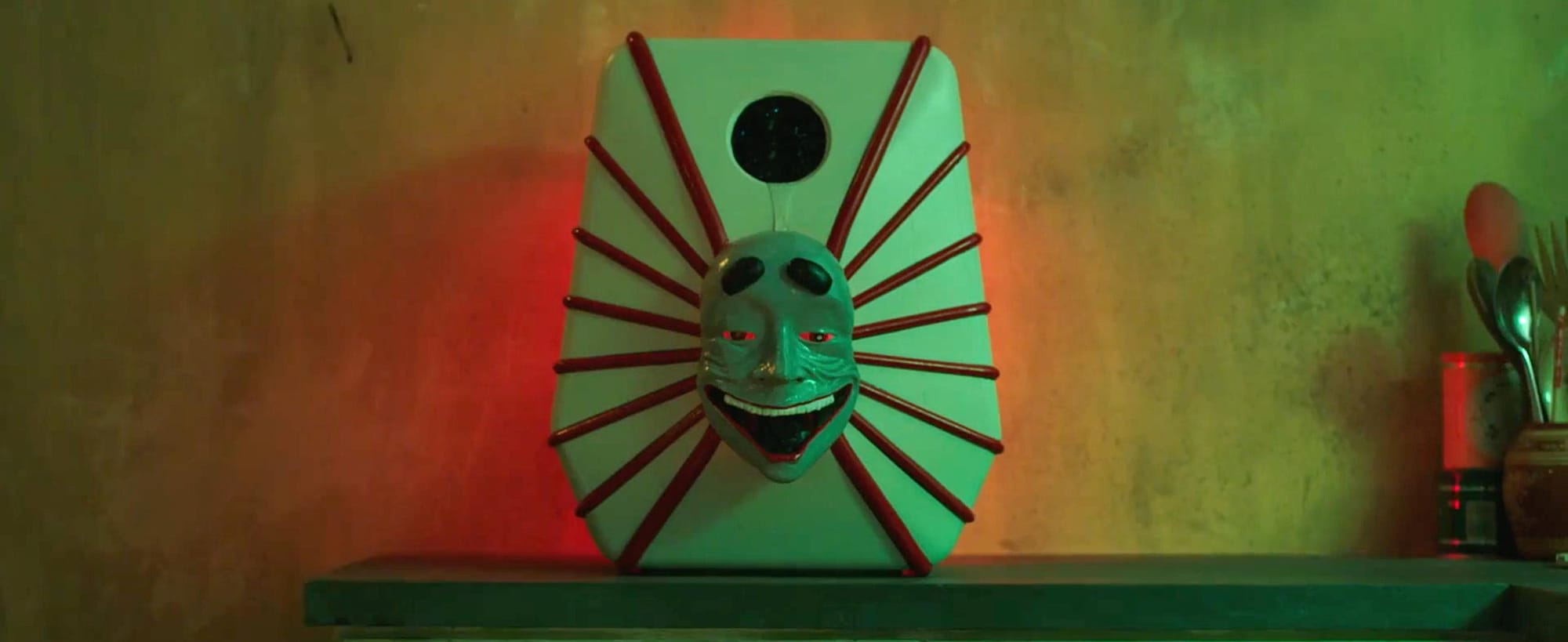 Part of what is so truly unsettling about Sushi Noh, and what easily makes it one of the most impressive and shocking horror short films in recent years, is the design of the sushi machine itself. Billed as a sushi-making device where the user pushes in the ingredients and it spits out a perfect sushi roll, the Sushi Noh machine is a beast of a machine where the user interacts with a Noh mask interface. With dark brows, foreboding eyes, and a menacing grin, the Noh mask is particularly terrifying, especially when it starts pushing out a moist sushi roll made with slimy fish and starchy rice. Jayden Rathsam Hüa delights in the horror of the machine and its culinary output, utilising its disturbing presence alongside the grotty walls of the apartment to amplify the nausea-inducing terror on display.