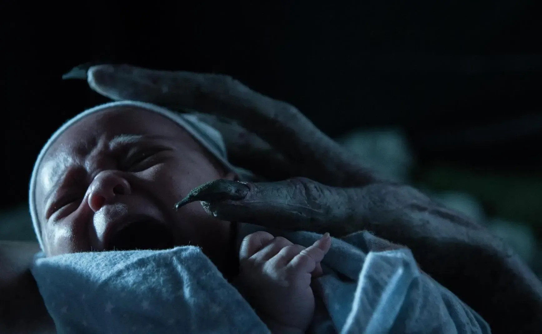 Jon Bell’s short The Moogai atmospheric, familial-focused horror operates on the flipside of Sushi Noh’s gruesome horror. Here, Bell uses the genre to explore Indigenous stories and the intergenerational trauma of the Stolen Generation, entwining these themes with the story of young couple Sarah (Shari Sebbens) and Fergus (Meyne Wyatt) who are starting their life as a family with the arrival of their newborn baby. Bell drapes each scene in a cold, sterile uninviting blue sheen, amplifying the notion that there’s something nefarious lingering in Sarah and Fergus’ home. Before too long, we grow to realise that the darkness that looms is a malevolent spirit called the Moogai.