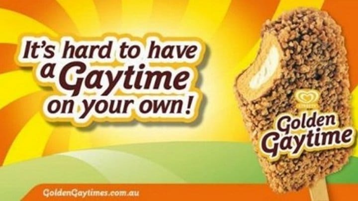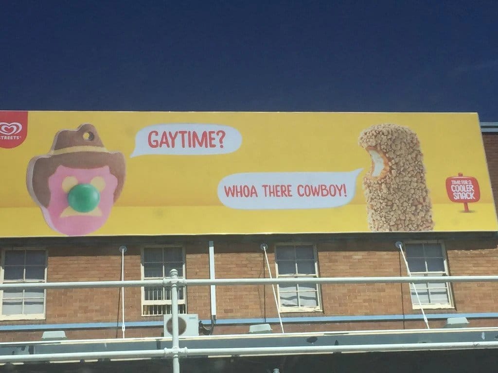 There’s a real vibe of both-sides-ing the situation here, with Streets coming across to the public as being both an ally of the queer community, while also suggesting that, hey, it’s just a major coincidence that the word gay means two things now. Streets has continually used the homosexual intonation of Gaytime for its own advertising advantage with its slogans and advertising, such as when they referred to the Oscar winning gay drama, Brokeback Mountain, in this advertisement: