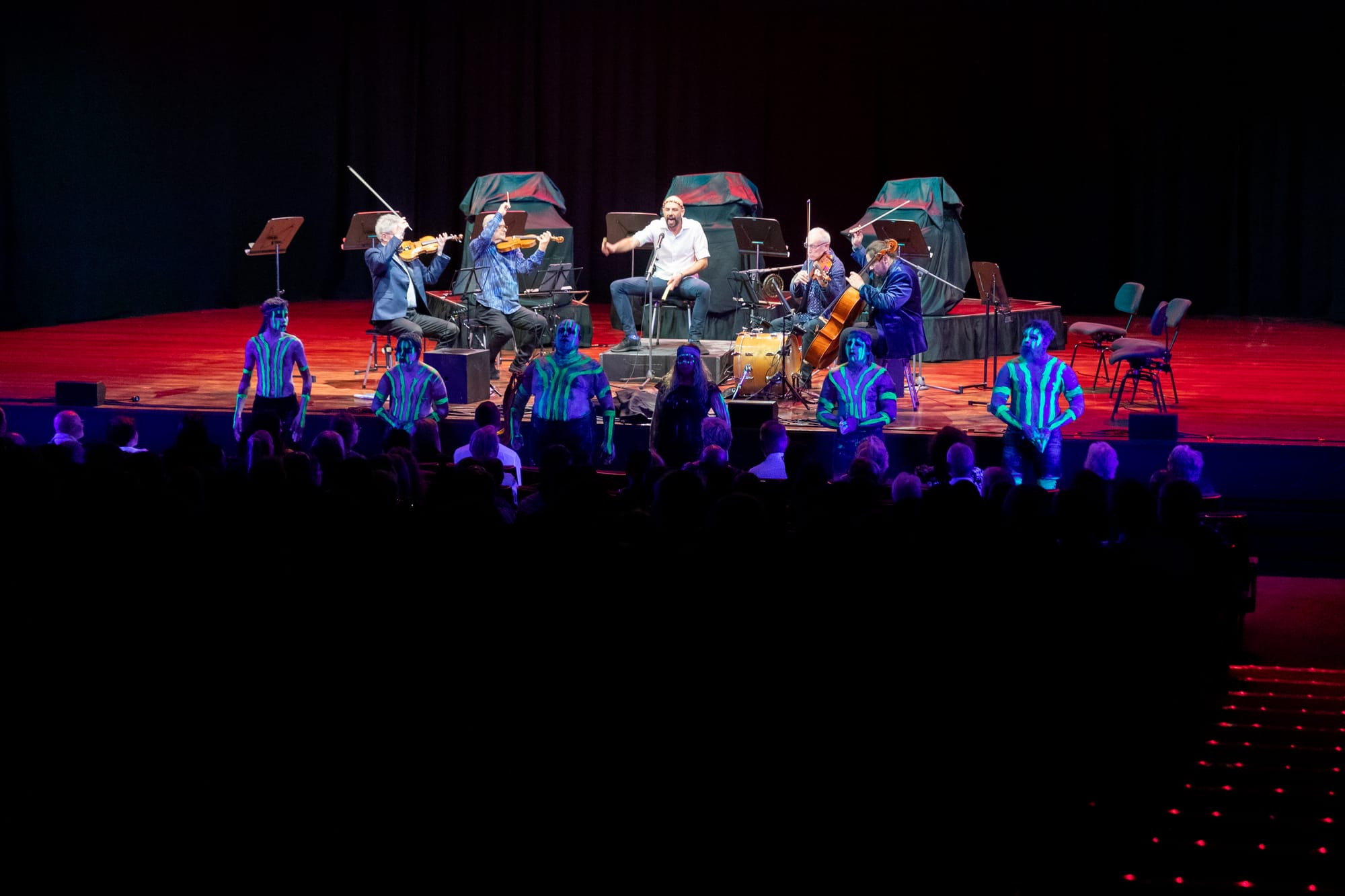 When Kronos invited Maatakitj on stage to present their collaboration, the ceiling was transformed into the night sky, with the lights bouncing off the reflective pipes of the organ that stands at the back of the stage. As Ruben Yorkshire and his fellow performers took the front of the stage, UV lights turned their painted bodies into moving neon visions that cut through the darkness of the auditorium. In unison, Kronos, Maatakitj, Ruben, and the other performers, became the stories of Noongar Boodjar, they became the creatures who once called the Derbarl Yerrigan home, they became the past, the present, and the future all at once. They became an impossibility: nature without humanity.
